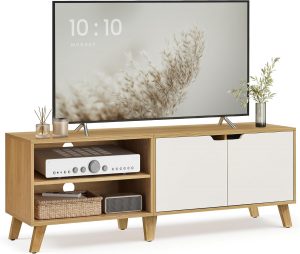 • [Stabils un izturīgs dizains] Ar robustu konstrukciju no koka izskata plātnēm un tērauda šis TV galds piedāvā 147 cm platu virsmu, kas piemērota TV līdz 65 collām. Tas var izturēt līdz pat 90 kg, nodrošinot stabilitāti jūsu izklaides sistēmai.