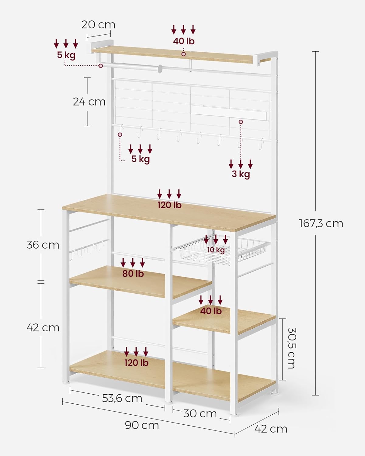 Maks. Statiskā kravnesība: augšējā plāksne: 18 kg. Darba virsma: 54,5 kg. Liels plaukts vidējā zonā: 36 kg. Mazais plaukts: 18 kg. Liels plaukts apakšējā daļā: 55 kg