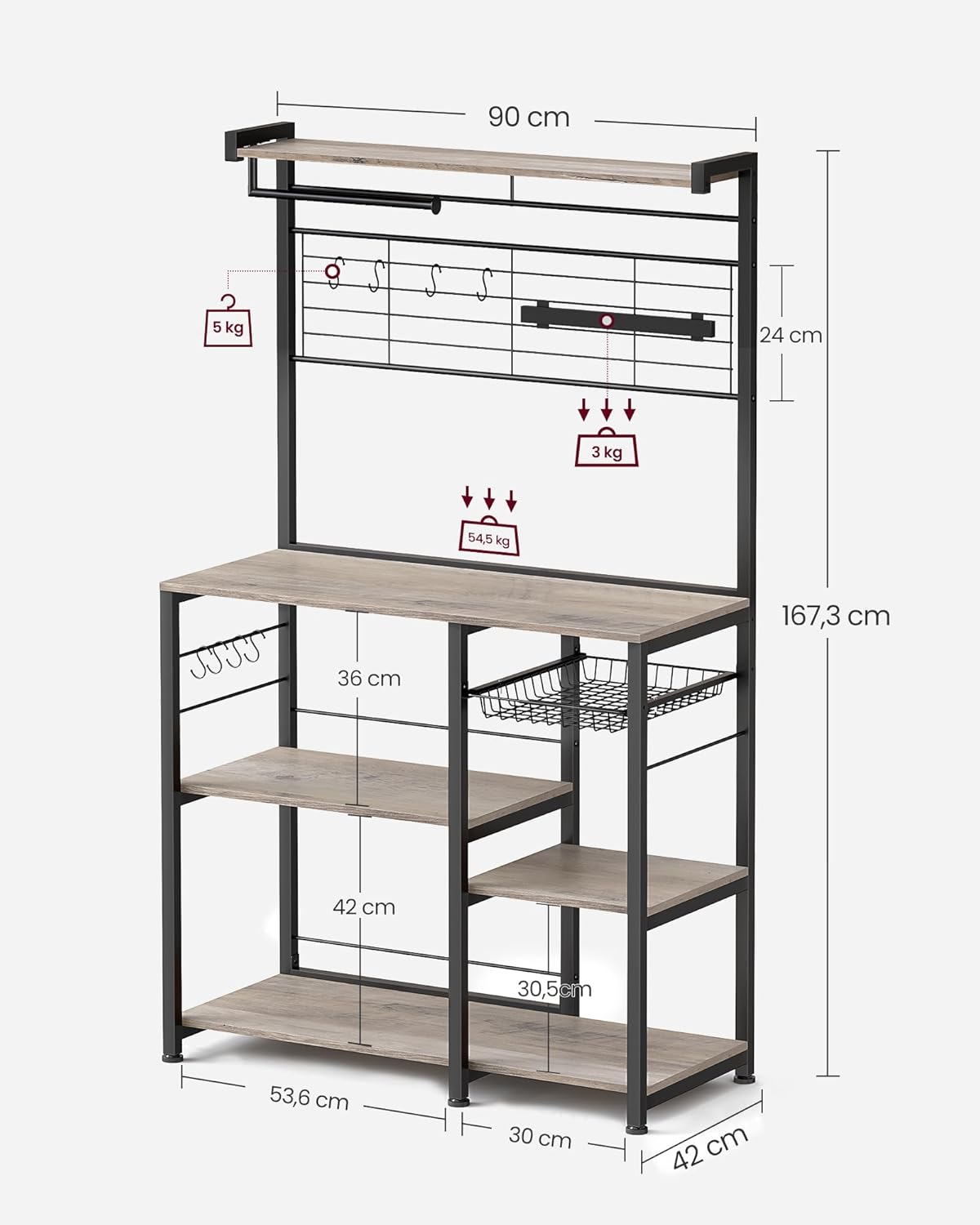 Maks. Statiskā kravnesība: augšējā plāksne: 18 kg. Darba virsma: 54,5 kg. Liels plaukts vidējā zonā: 36 kg. Mazais plaukts: 18 kg. Liels plaukts apakšējā daļā: 55 kg